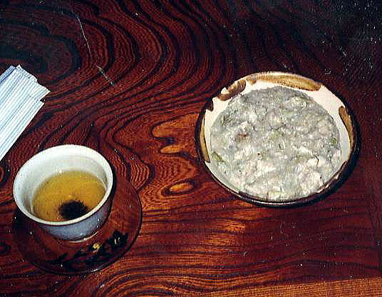 かつおで出汁をとりデンプンを入れるとすぐに粘りが出てきます。これに三枚肉やイカ等をいれ味噌で味を調えて出来上がり。