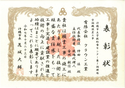 令和3年10月22日に令和3年度 沖縄市優良建設工事表彰式が行われ、 有限会社 クラウン工業・有限会社 東部水道工事社JVで施工した 「沖縄市立山内中学校空調機能復旧工事」で表彰を受ける事が出来ました。 工事に携わって下さった全ての皆様に感謝致します。